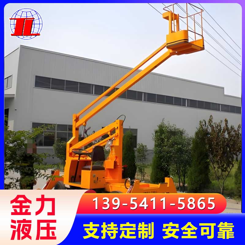 一种利用汽车引擎动力驱动的折臂式高空作业车。车辆的行走功能,使升降平台有更好的灵活性和机动性,使高空作业效率更高。折臂结构紧凑,采用新型型钢,强度高,重量轻,架设速度快,工作台既可升高又可水平延伸,还可旋转360度,易于跨越障碍到达工作位置。